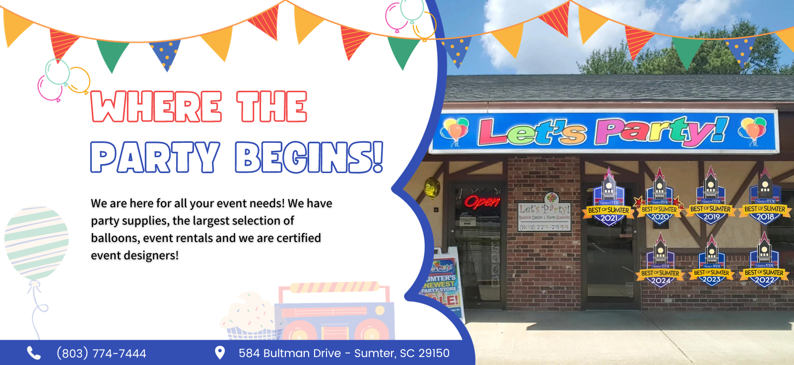Let’s Party! is a retail store that is located at 584 Bultman Drive in Sumter, SC; where we offer a full line of party supplies for all kinds of events, such as birthday parties, retirement parties, anniversary parties, weddings, family reunions, baby showers, bachelorette parties, holiday celebrations and so much more!